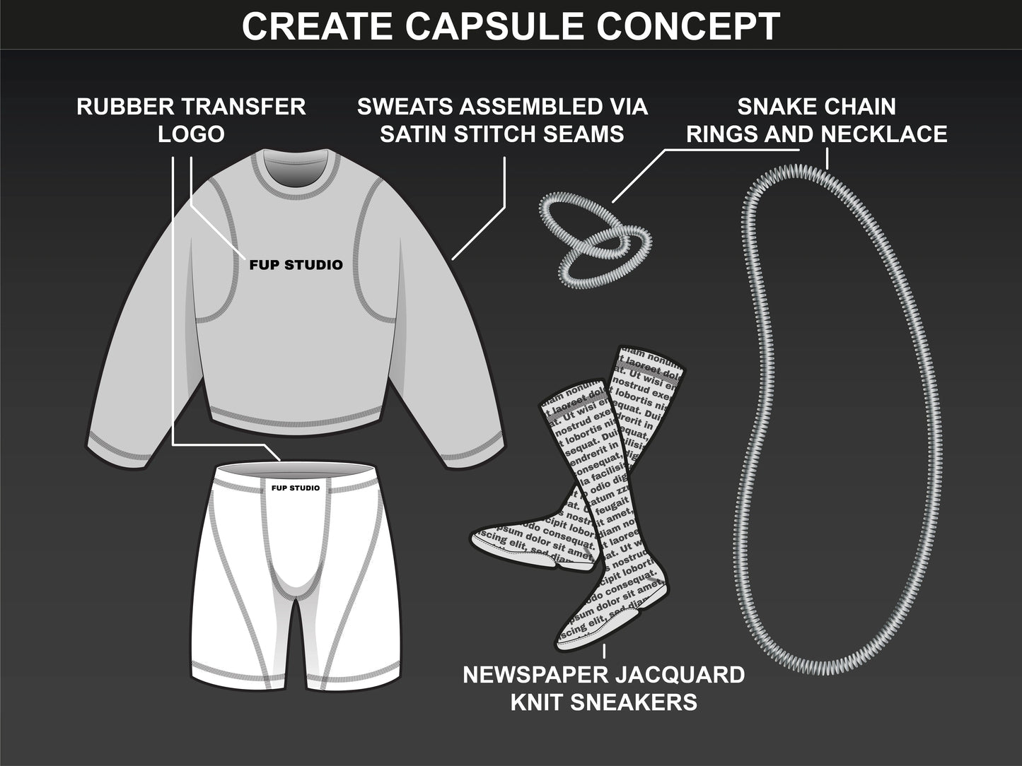 Capsule collection concept using FUPstudio’s Stitch Brushes, featuring apparel and accessory mockups.