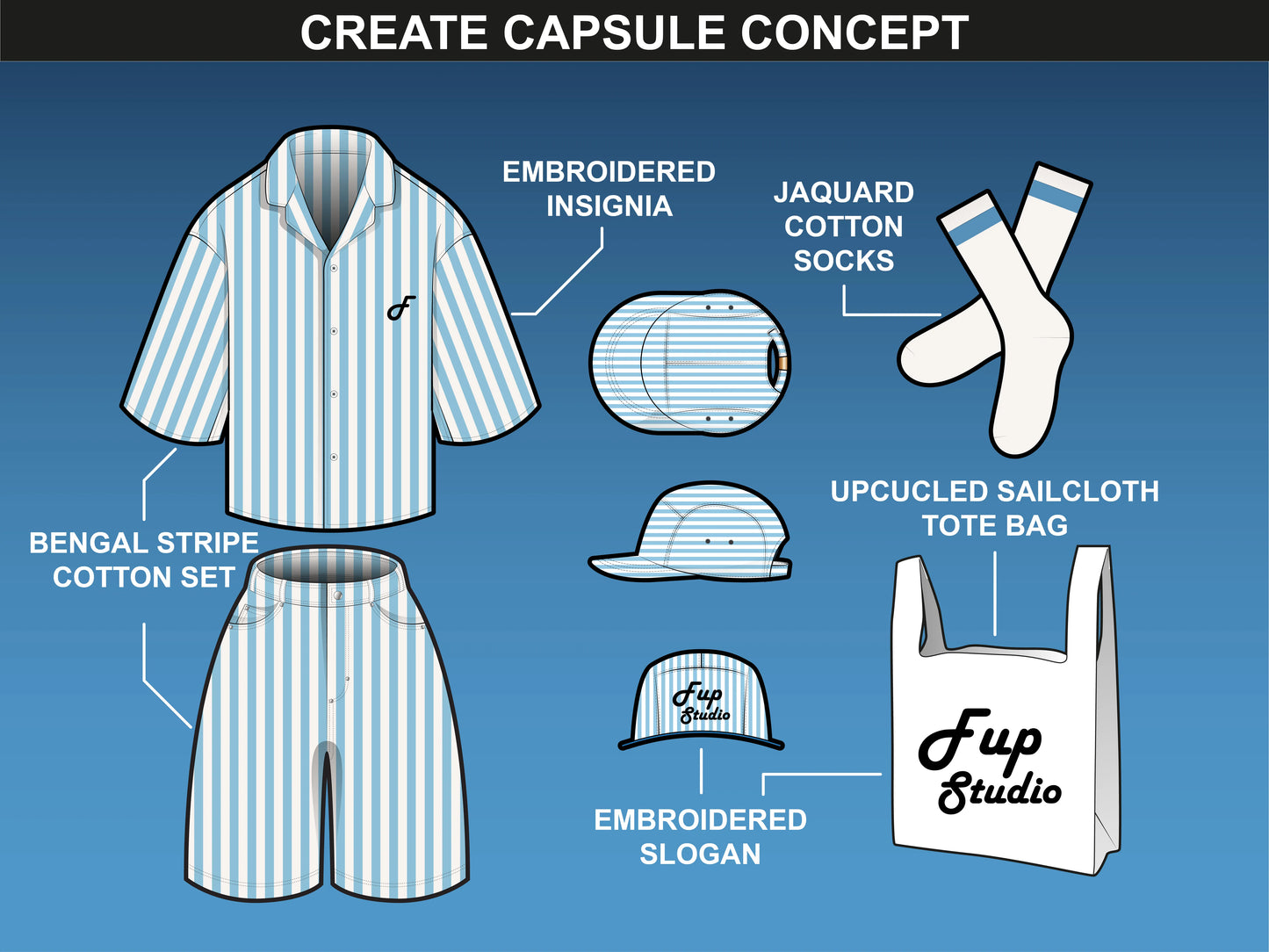 FUPstudio fashion concept featuring stripe pattern apparel, embroidered accessories, and textile elements.