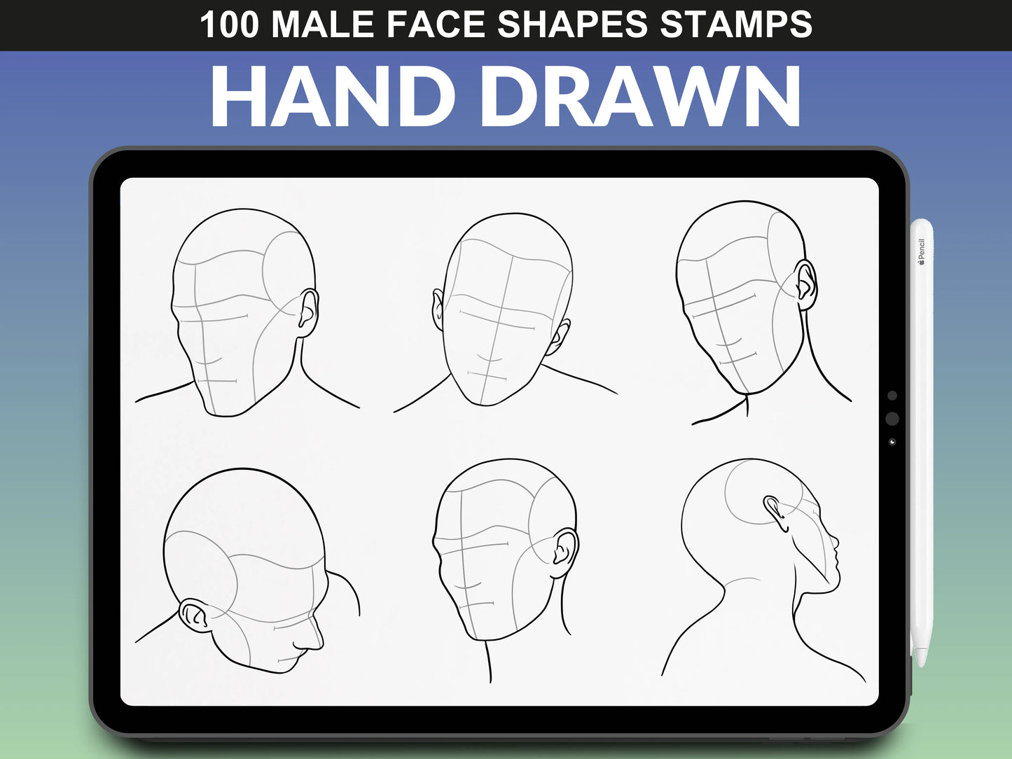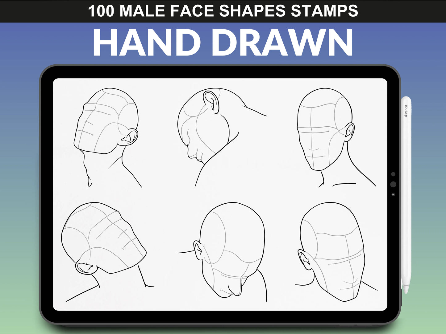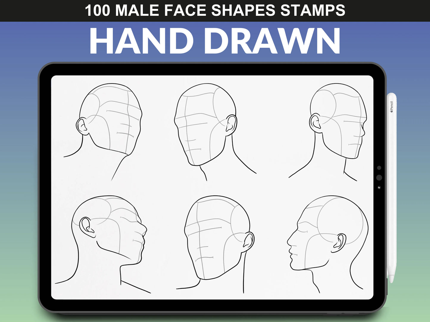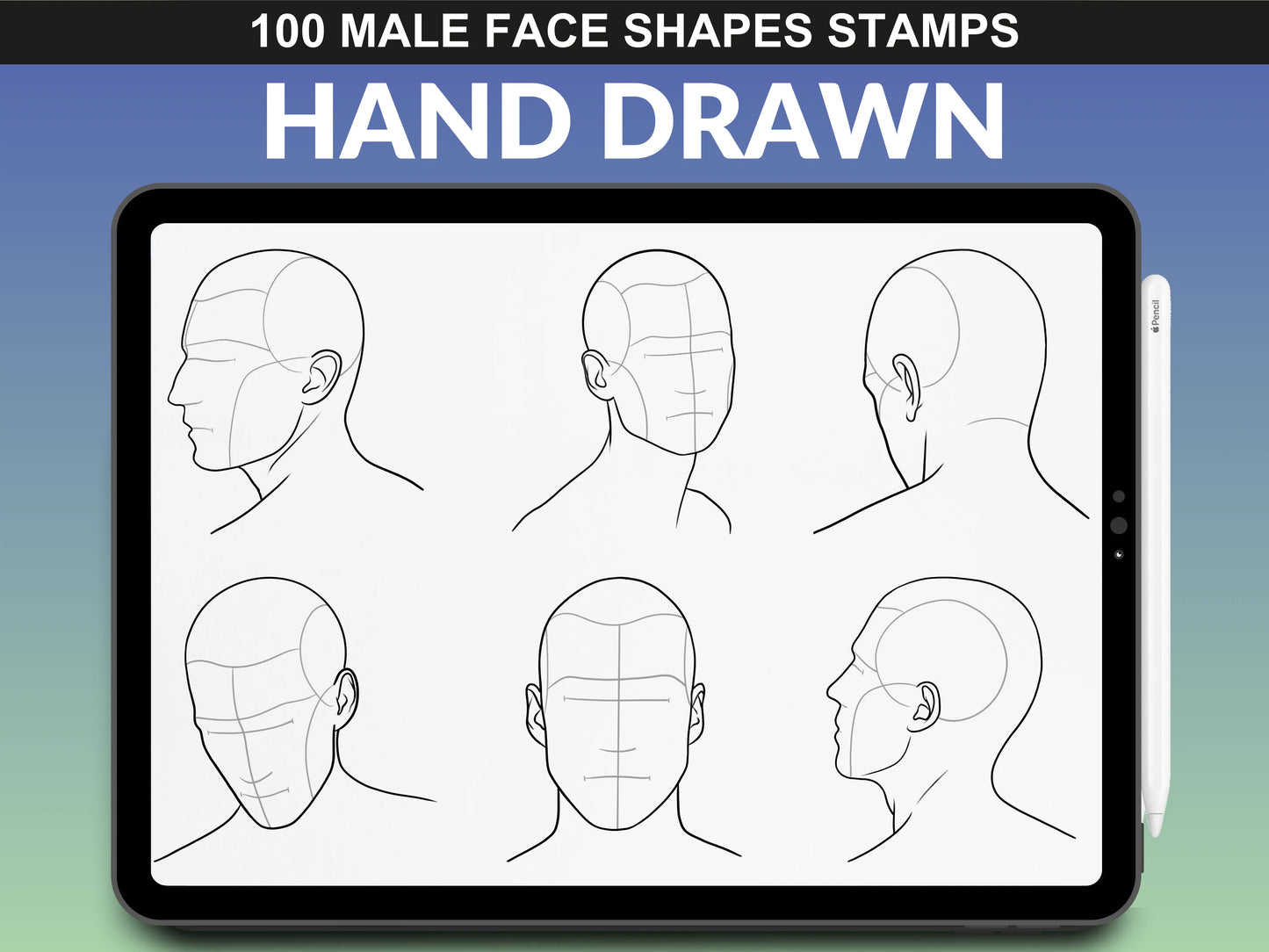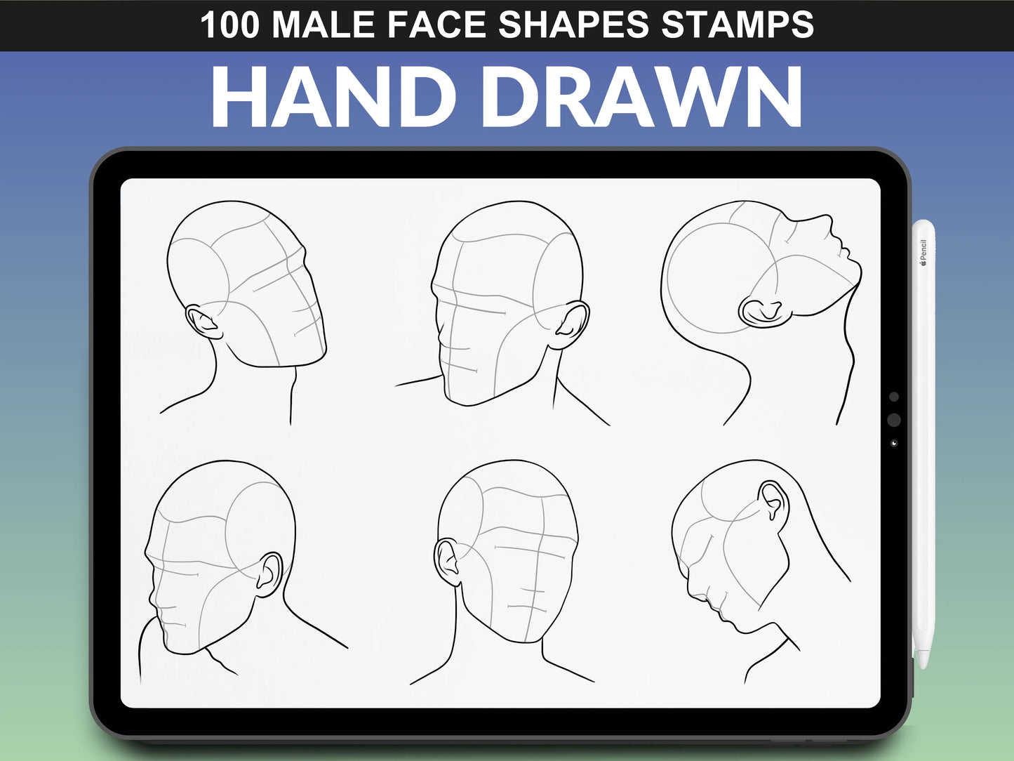 Procreate Male Heads brush set by FUPstudio, offering structured head shapes in multiple orientations.
