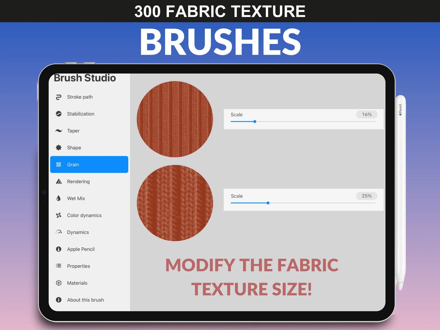 Regular price $9.95 USDTake your fashion illustrations to the next level with FUPstudio’s 300 Fabric Brushes for Procreate! This ultimate brush pack is designed for textile designers, illustrators, and apparel creatives looking to add realistic fabric textures to their digital garments. From classic weaves to bold plaids and fine knits, each brush is crafted for intuitive use and seamless application.