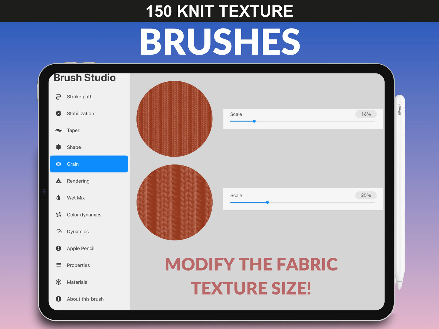 fupstudio Knit Texture Brushes scale customization feature shown in Procreate Brush Studio panel